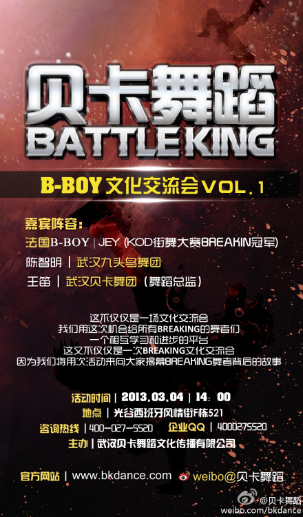 貝卡舞蹈2013年將大力發(fā)展文化推廣交流和搭建更高的平臺,新年伊始送給BBOY們一份大禮:我們邀請到法國知名舞者來(lái)自L(fǎng)EGITEAM OBSTRUCTION的BBOY JEY來(lái)到BK CREW和全武漢的BBOY做一個(gè)交流的PARTY!所有參與的BBOY和觀(guān)眾全部免費!燥起來(lái)吧!