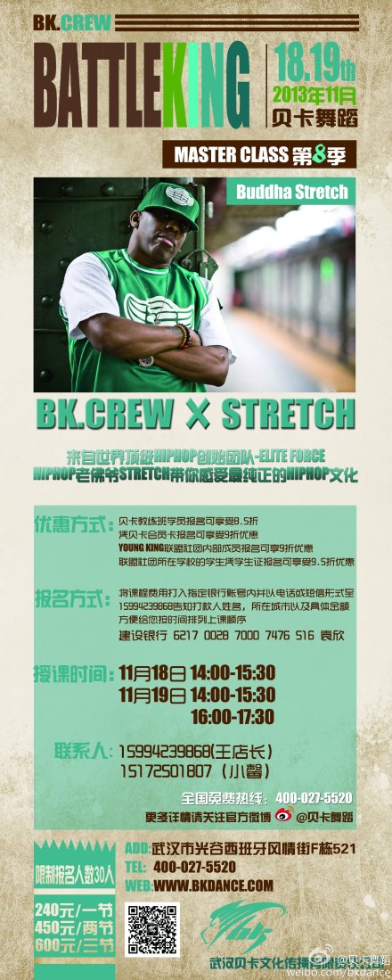重大消息:武漢DANCER的福利來(lái)啦!HIPHOP DANCE創(chuàng )始人之一、來(lái)自美國紐約ELITE FORCE的老佛爺BUDDHA STRETCH11月17空降武漢,鼻祖大師第一次來(lái)湖北武漢,絕佳的機會(huì )小伙伴們不要錯過(guò)哦! 名額有限,快來(lái)報名吧。
