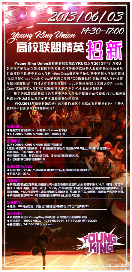 1、新浪微博關(guān)注@YoungKing高校聯(lián)盟 并把姓名電話(huà)舞種發(fā)私信